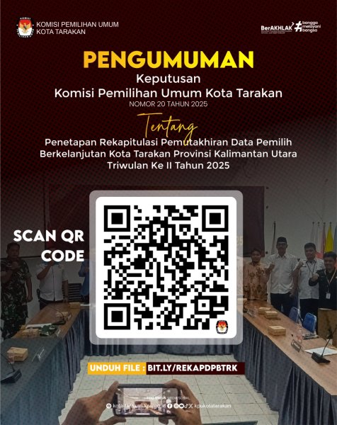 TARAKAN - Setelah melalui serangkaian kegiatan Pencocokan dan Penelitian Terbatas (Coktas) pada triwulan ke-III tahun 2025 ini, KPU Kota Tarakan melalui rapat pleno terbuka yang diselenggarakan pada tanggal 02 Oktober 2025, telah menetapkan Rekapitulasi Pemutakhiran Daftar Pemilih Berkelanjutan (PDPB) dengan diterbitkannya Keputusan KPU Kota Tarakan Nomor 27 Tahun 2025 tentang Penetapan Rekapitulasi Pemutakhiran Daftar Pemilih Berkelanjutan Kota Tarakan Provinsi Kalimantan Utara Triwulan Ke III Tahun 2025. Hal ini bertujuan diantaranya, pembaruan data pemilih agar selalu terbaru dan akurat, sebagai sarana sosialisasi untuk meningkatkan partisipasi publik dalam menjaga data kependudukan serta untuk mengurangi potensi masalah dalam penyusunan daftar pemilih, seperti data ganda atau data yang tidak sesuai. Sumber : Keputusan KPU Kota Tarakan Nomor 27 Tahun 2025 ....