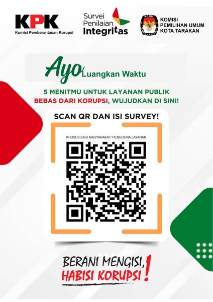 TARAKAN - Dalam rangka upaya pemberantasan korupsi, Komisi Pemberantasan Korupsi (KPK) Republik Indonesia menyelenggarakan Survei Penilaian Integritas (SPI) yang ditujukan kepada seluruh Kementerian/Lembaga/Pemerintah Daerah/BUMN di Indonesia termasuk pada Komisi Pemilihan Umum (KPU). Bagi responden yang telah menerima kuesioner survei melalui saluran komunikasi, agar segera merespon ketika terpilih menjadi responden SPI. Panduan pengisian kuesioner Survei Penilaian Integritas Tahun 2025 dapat diakses melalui link bit.ly/PanduanPengisianSPI2025 atau klik DISINI ....