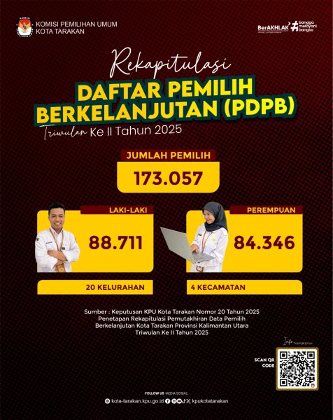 TARAKAN - Setelah melalui serangkaian kegiatan Pencocokan dan Penelitian Terbatas (Coktas) pada triwulan ke-II tahun 2025 ini, KPU Kota Tarakan melalui rapat pleno terbuka yang diselenggarakan pada tanggal 2 Juli 2025, telah menetapkan Rekapitulasi Pemutakhiran Data Pemilih Berkelanjutan (PDPB) dengan diterbitkannya Keputusan KPU Kota Tarakan Nomor 20 Tahun 2025 tentang Penetapan Rekapitulasi Pemutakhiran Data Pemilih Berkelanjutan Kota Tarakan Triwulan II Tahun 2025. Hal ini bertujuan diantaranya, pembaruan data pemilih agar selalu terbaru dan akurat, sebagai sarana sosialisasi untuk meningkatkan partisipasi publik dalam menjaga data kependudukan serta untuk mengurangi potensi masalah dalam penyusunan daftar pemilih, seperti data ganda atau data yang tidak sesuai. Sumber : Keputusan KPU Kota Tarakan Nomor 20 Tahun 2025