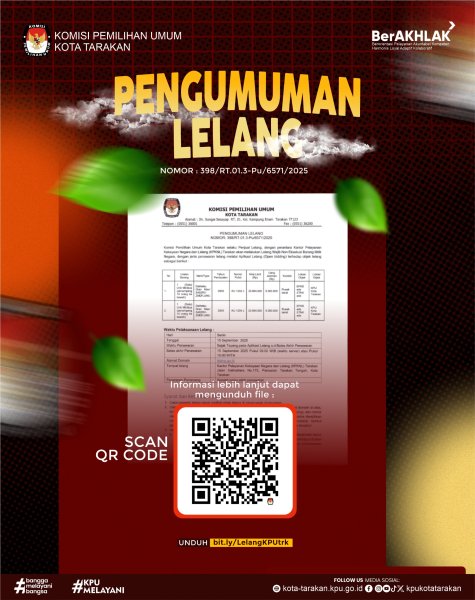 Berikut disampaikan Pengumuman Lelang Nomor : 398/RT.01.3-Pu/6571/2025 KPU Kota Tarakan selaku Penjual Lelang dengan perantara Kantor Pelayanan Kekayaan dan Lelang (KPKNL) Tarakan.