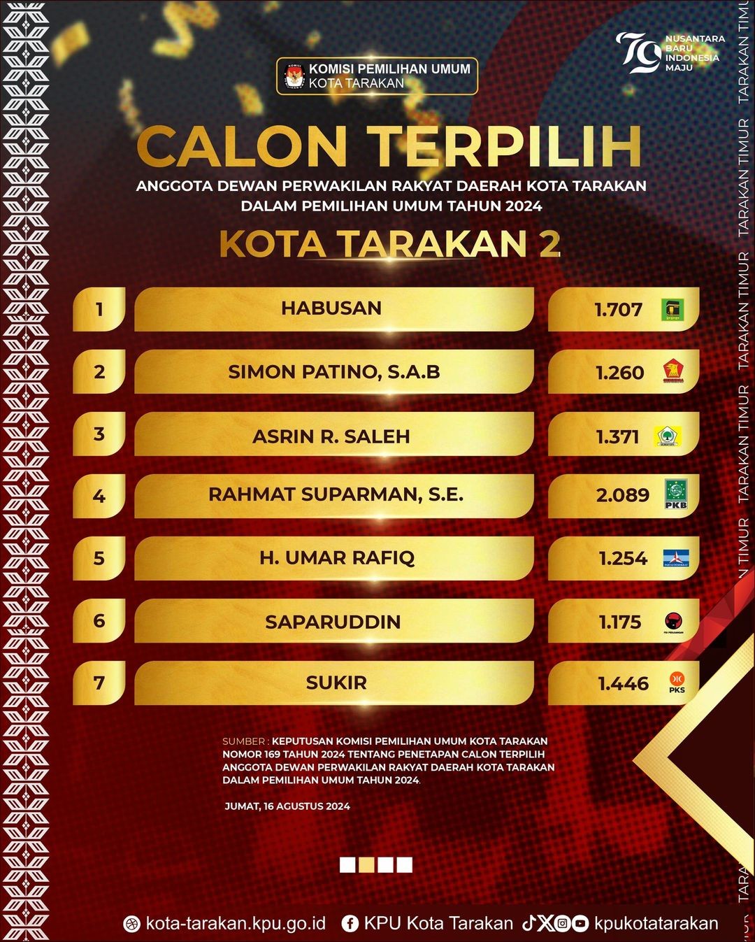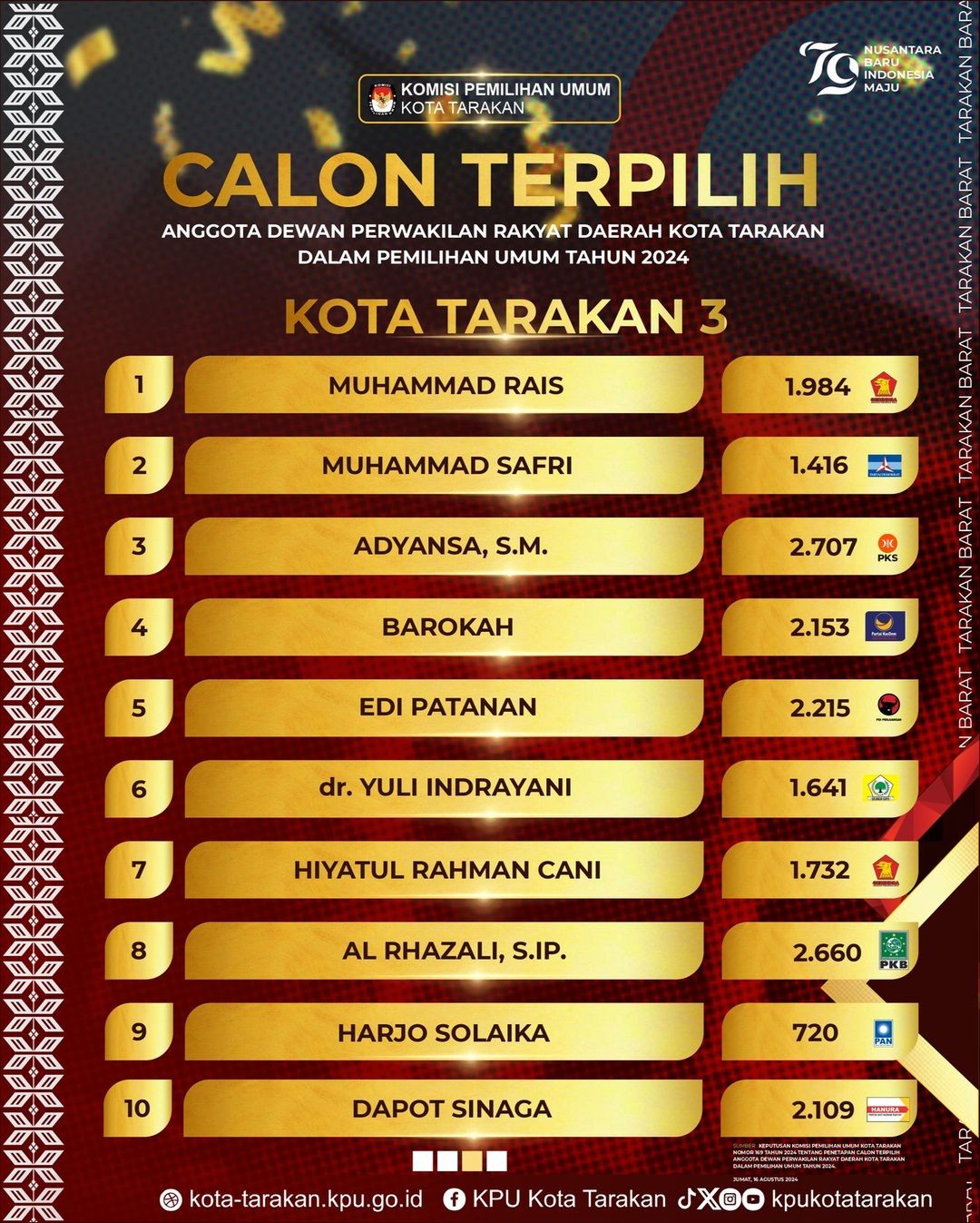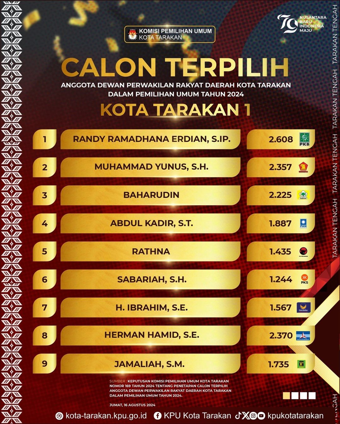 Berikut ini Calon Terpilih Anggota Dewan Perwakilan Rakyat Daerah Kota Tarakan dalam Pemilihan Umum Serentak Tahun 2024 :