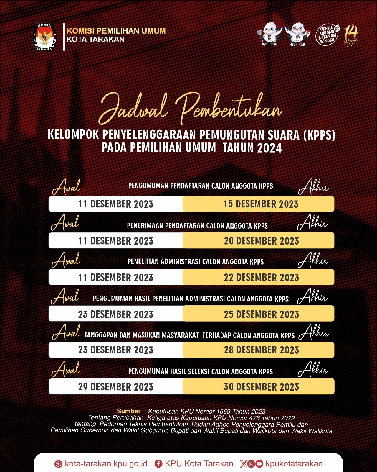 Dalam rangka pembentukan Kelompok Penyelenggara Pemungutan Suara (KPPS) untuk Pemilihan Umum Tahun 2024, Komisi Pemilihan Umum Kota Tarakan mengundang Warga Negara Indonesia yang memenuhi persyaratan untuk mendaftarkan diri menjadi anggota KPPS untuk Pemilihan Umum Tahun 2024.