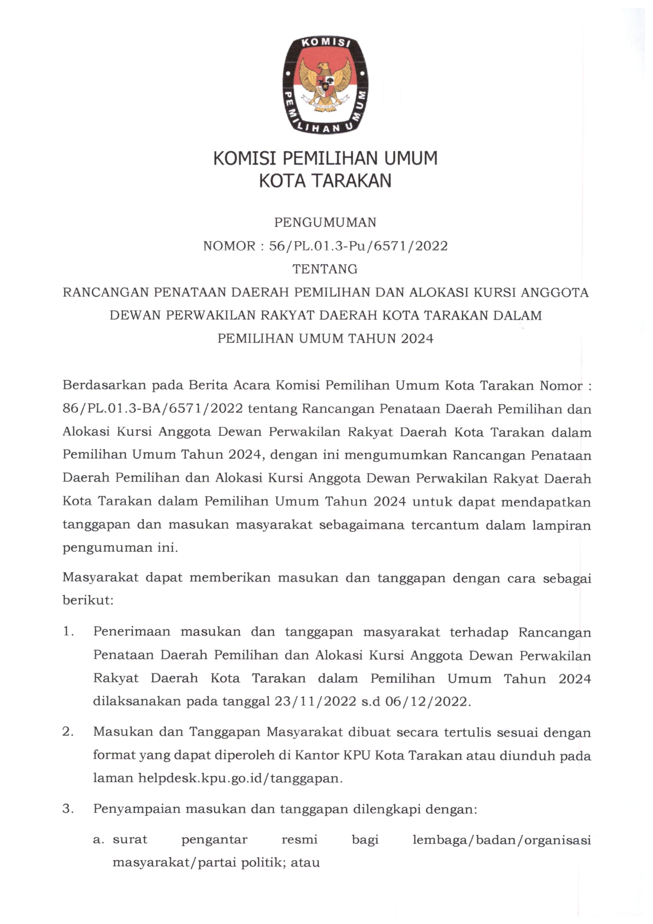 Dengan ini disampaikan pengumuman KPU Kota Tarakan Nomor 56/PL.01.3-Pu/6571/2022 tentang Rancangan Penataan Daerah Pemilihan dan Alokasi Kursi Anggota DPRD Kota Tarakan dalam Pemilu 2024, klik disini untuk mengunduh -> Download