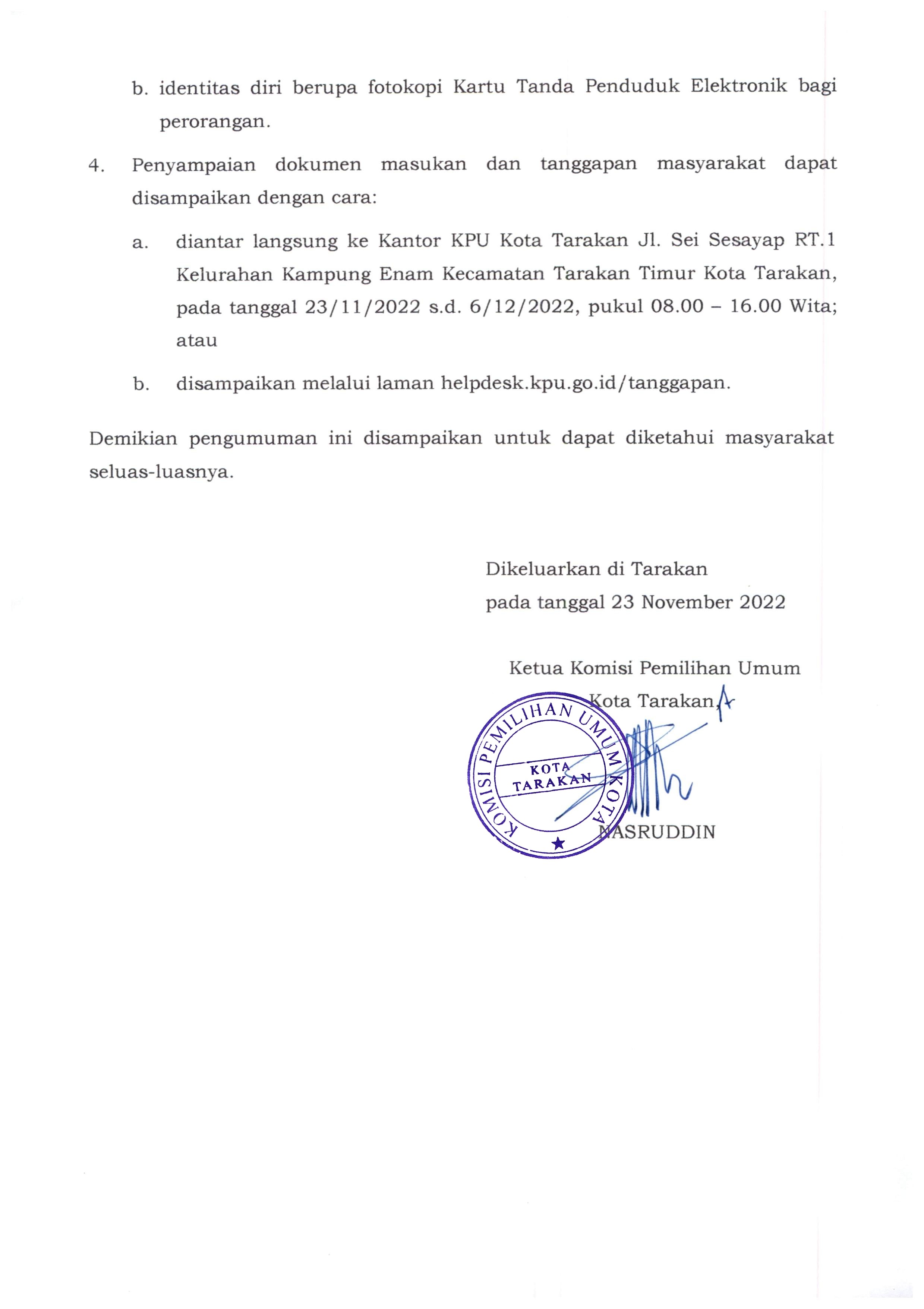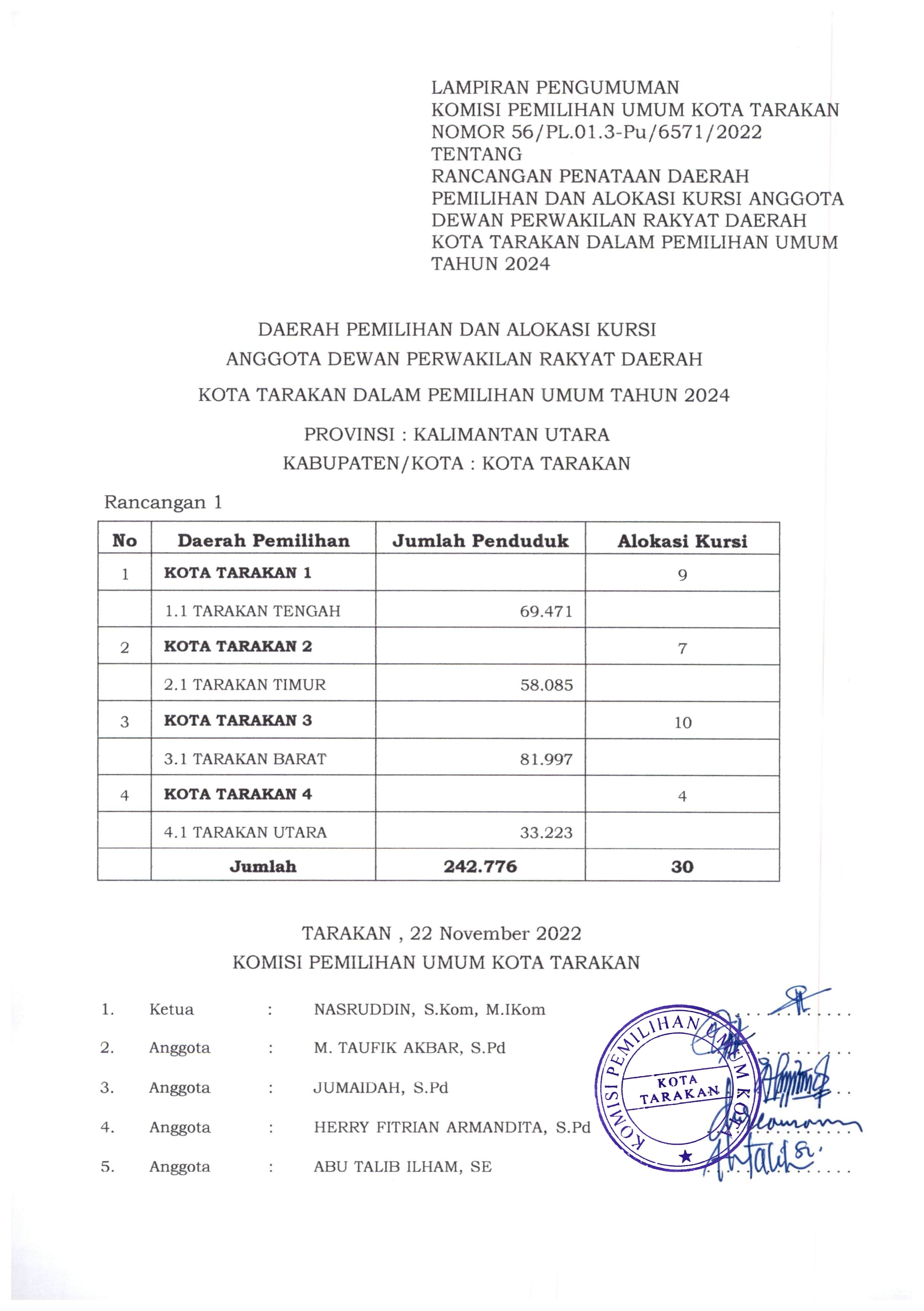 Pengumuman Rancangan Penataan Daerah Pemilihan dan Alokasi Kursi Anggota DPRD Kota Tarakan dalam Pemilu Tahun 2024