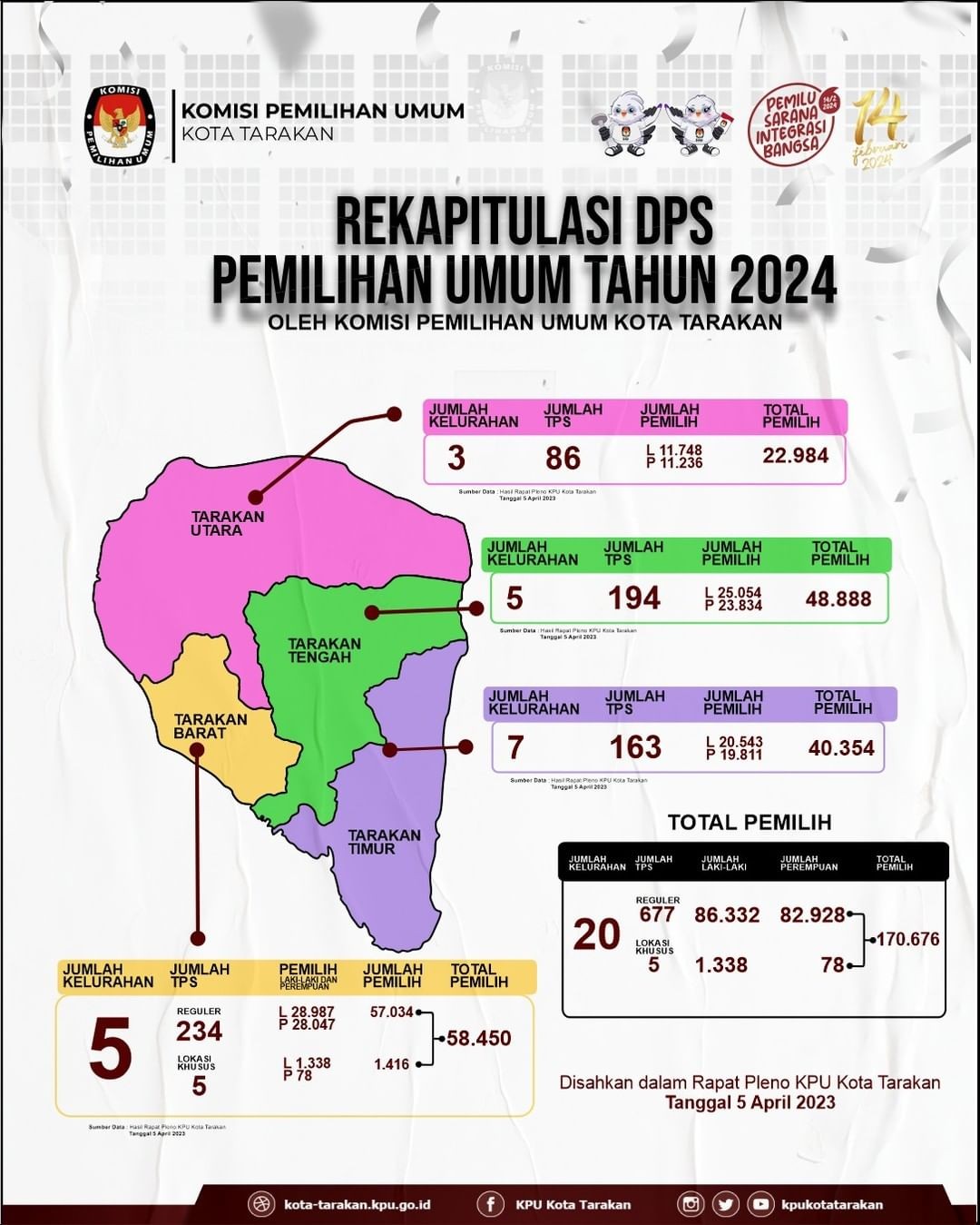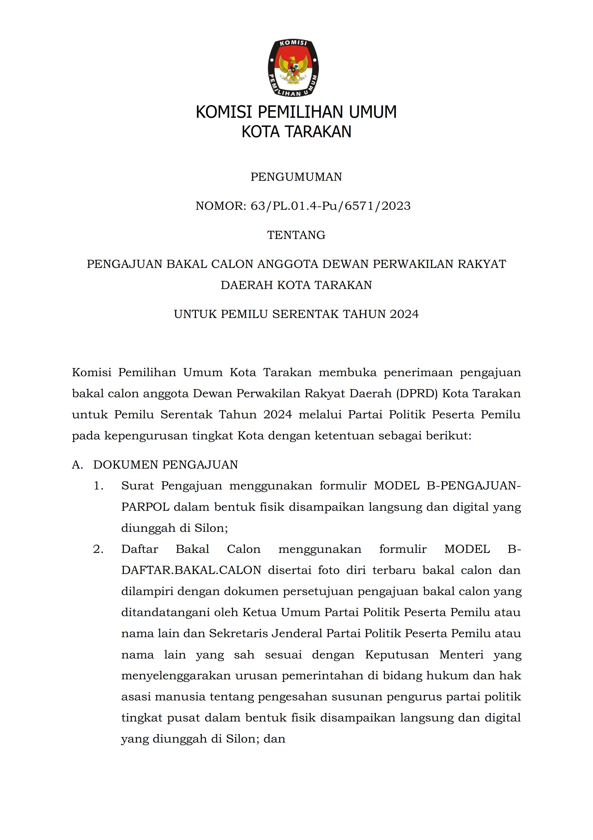 Tarakan-KPU Kota Tarakan membuka Penerimaan Pengajuan Bakal Calon Anggota DPRD Kota Tarakan untuk Pemilu Serentak Tahun 2024, Penerimaan Pengajuan Bakal Calon Anggota DPRD Kota Tarakan untuk Pemilu Serentak Tahun 2024 akan dilaksanakan pada tanggal 1 s.d 14 Mei 2023 dengan ketentuan untuk tanggal 1 - 13 Mei 2023 dilaksanakan mulai Pukul 08.00 s.d 16.00 Wita, sedangkan untuk tanggal 14 Mei 2023 dilaksanakan mulai Pukul 08.00 s.d 23.59 Wita