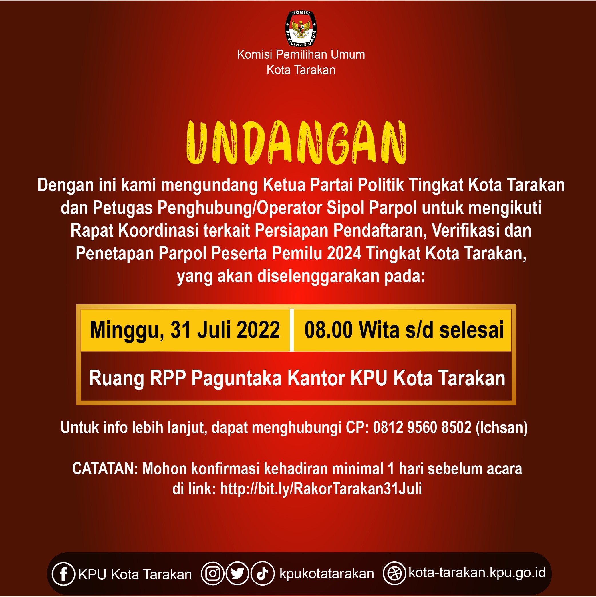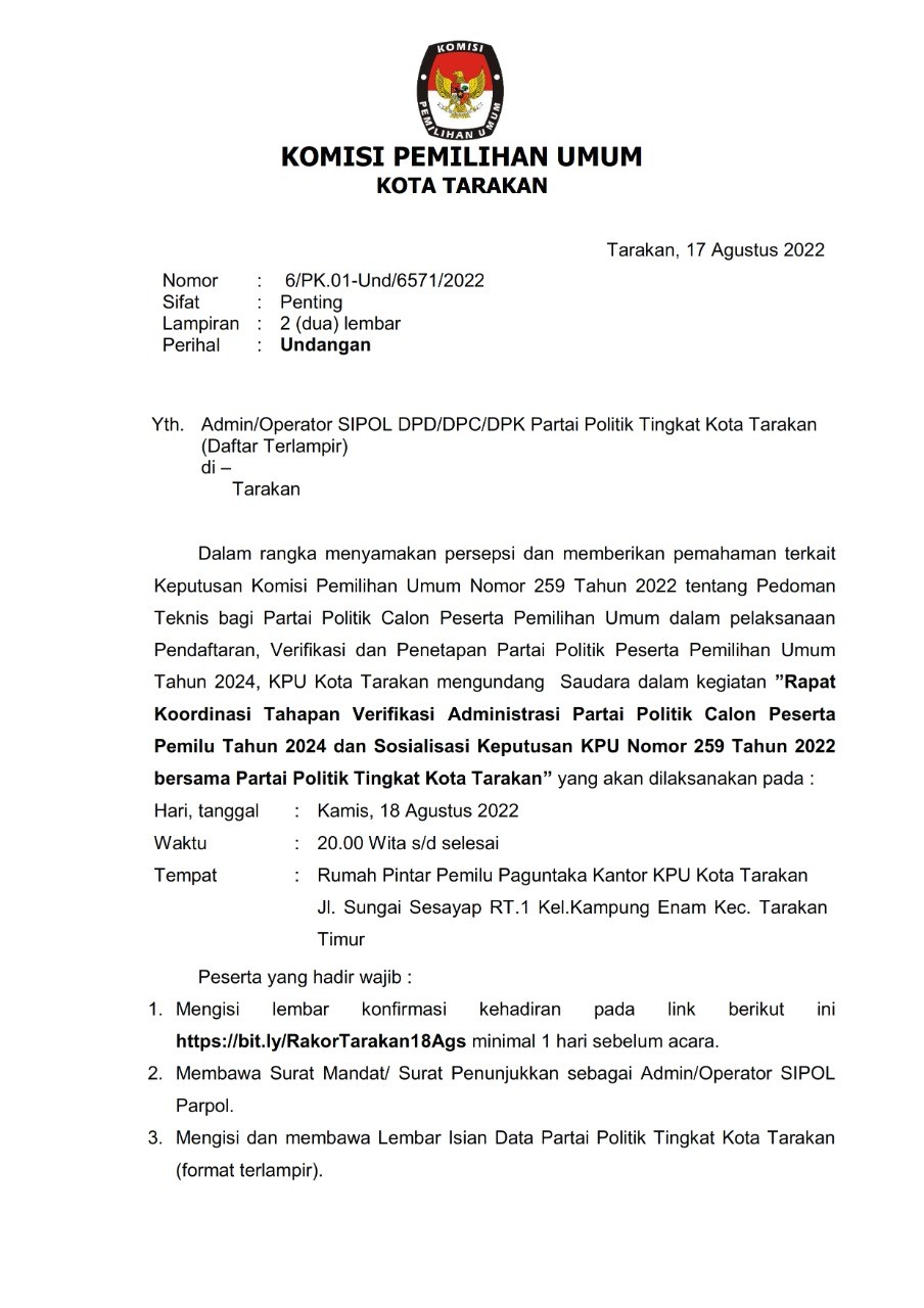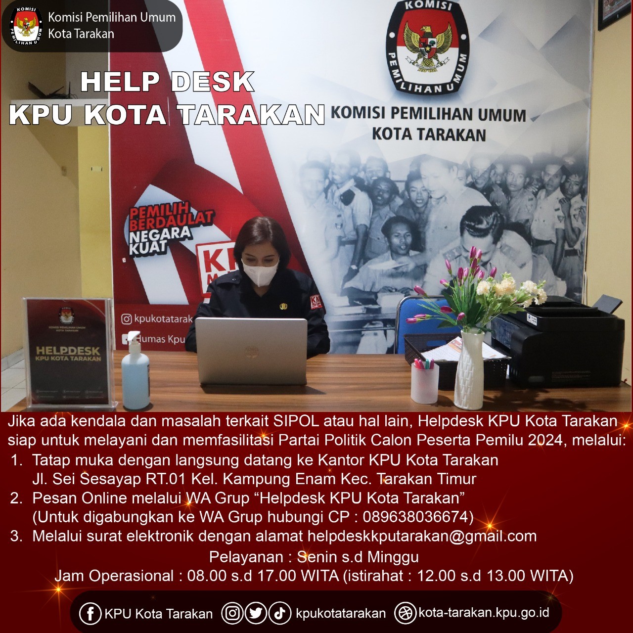 Diberitahukan bahwa KPU Kota Tarakan telah membentuk Helpdesk KPU Kota Tarakan untuk melayani dan memfasilitasi partai politik yang menemukan kendala saat penggunaan SIPOL maupun yang ingin konsultasi terkait tahapan pendaftaran, verifikasi dan penetapan partai politik calon peserta Pemilu 2024.