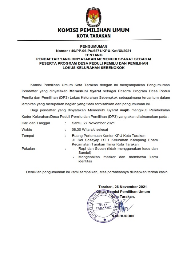 Pengumuman Pendaftar yang Dinyatakan Memenuhi Syarat sebagai Peserta DP3 Lokus Kelurahan Sebengkok Jumat, 26 November 2021 00:00 403 Baca Selengkapnya