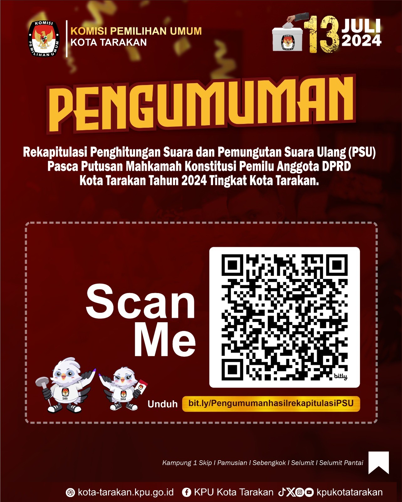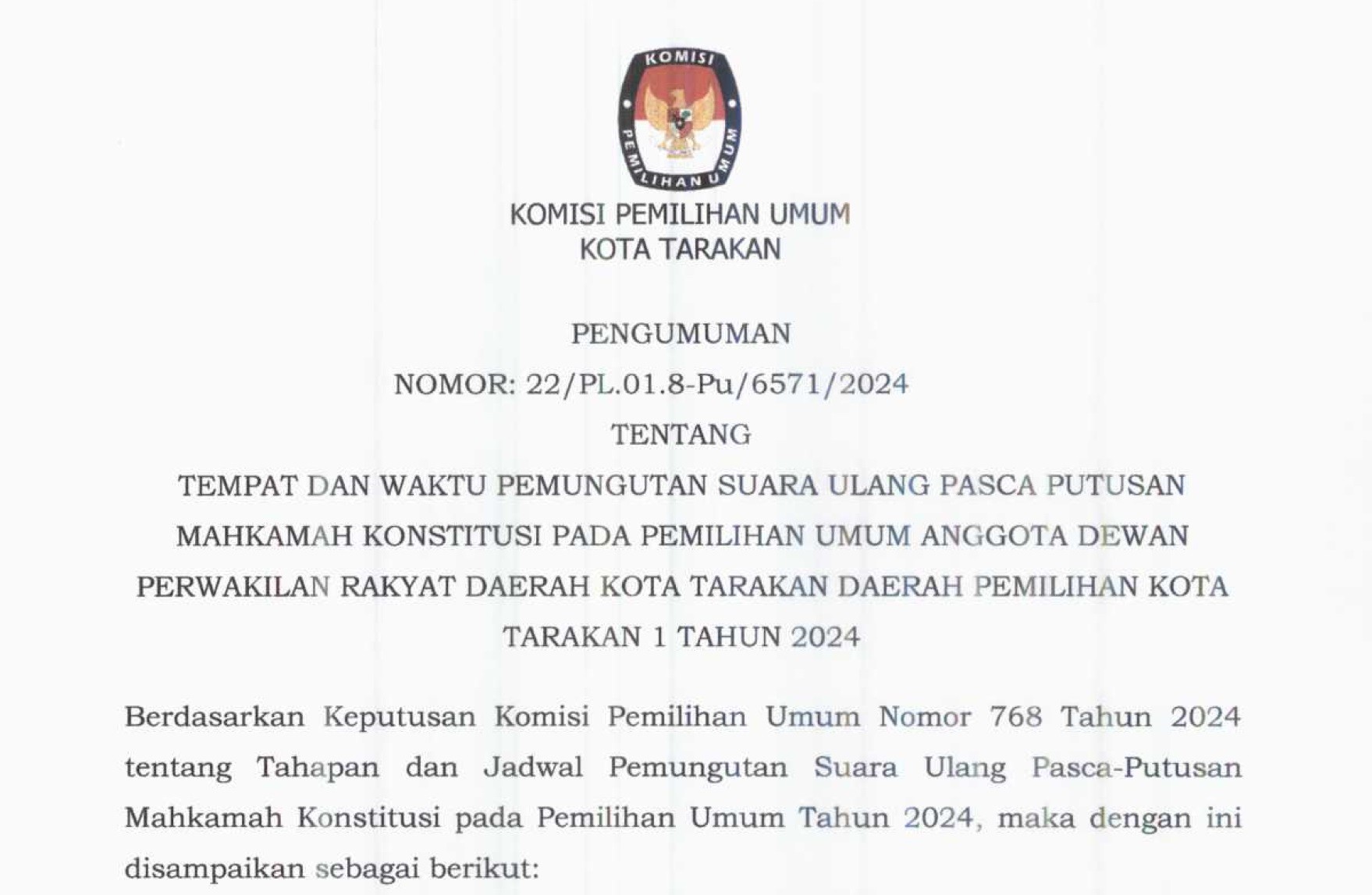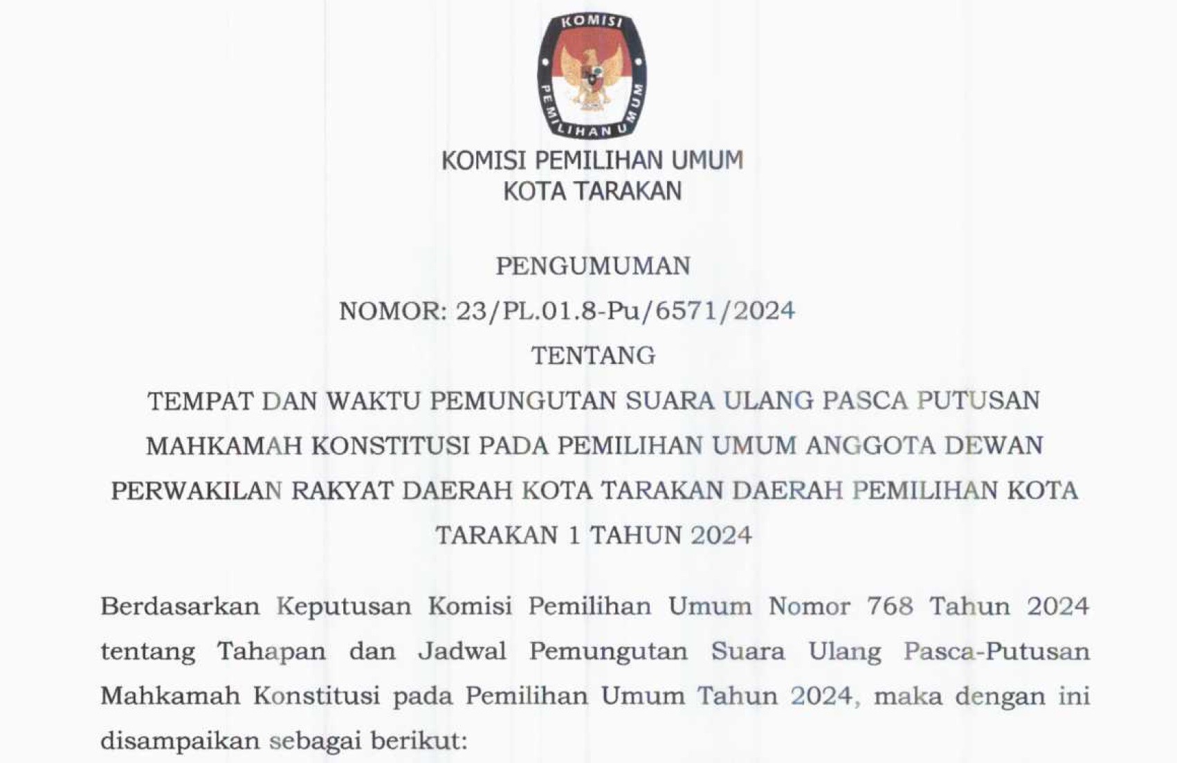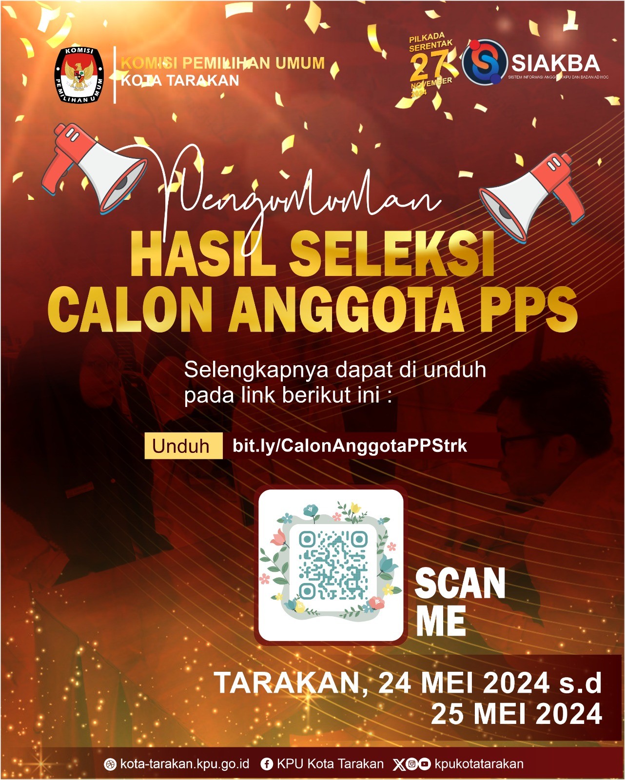 Berikut disampaikan Pengumuman Nomor 19/PP.04.2-Pu/6571/2024 tentang Hasil Penetapan Seleksi Calon Anggota Panitia Pemungutan Suara (PPS) untuk Pemilihan Gubernur dan Wakil Gubernur, Bupati dan Wakil Bupati dan Wali Kota dan Wakil Wali Kota pada Kota Tarakan Tahun 2024.