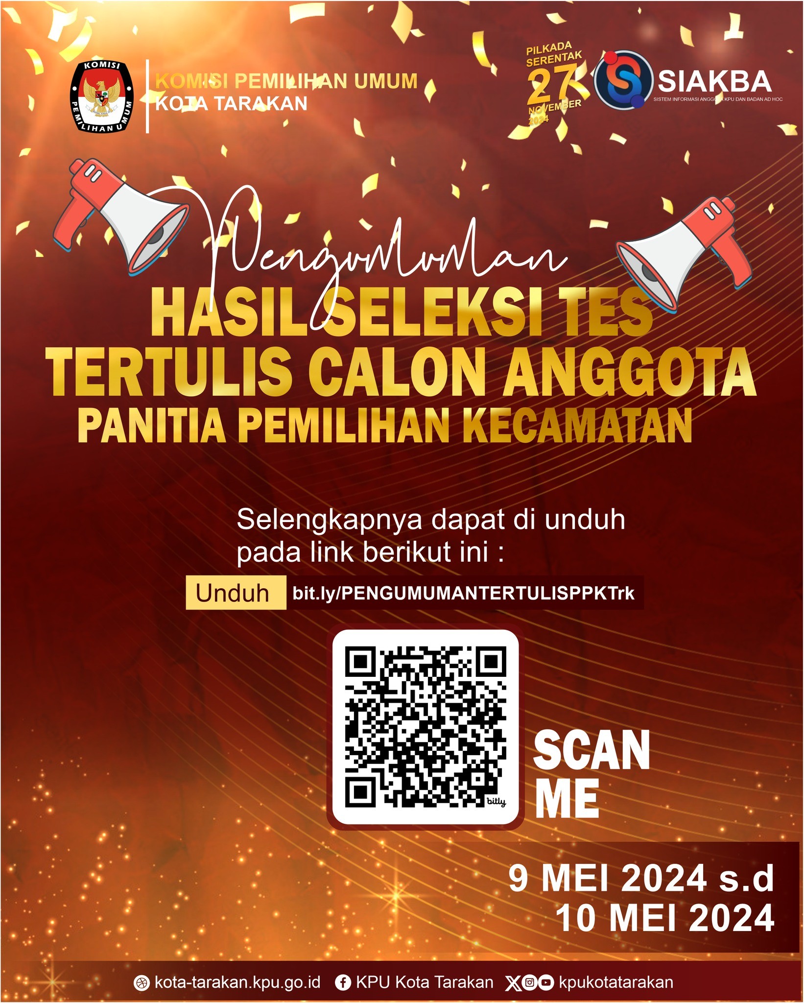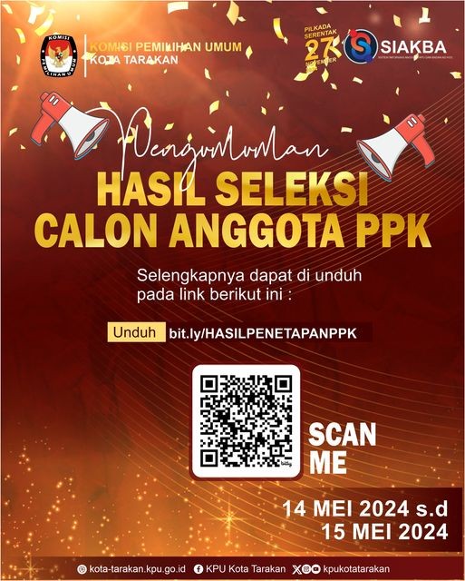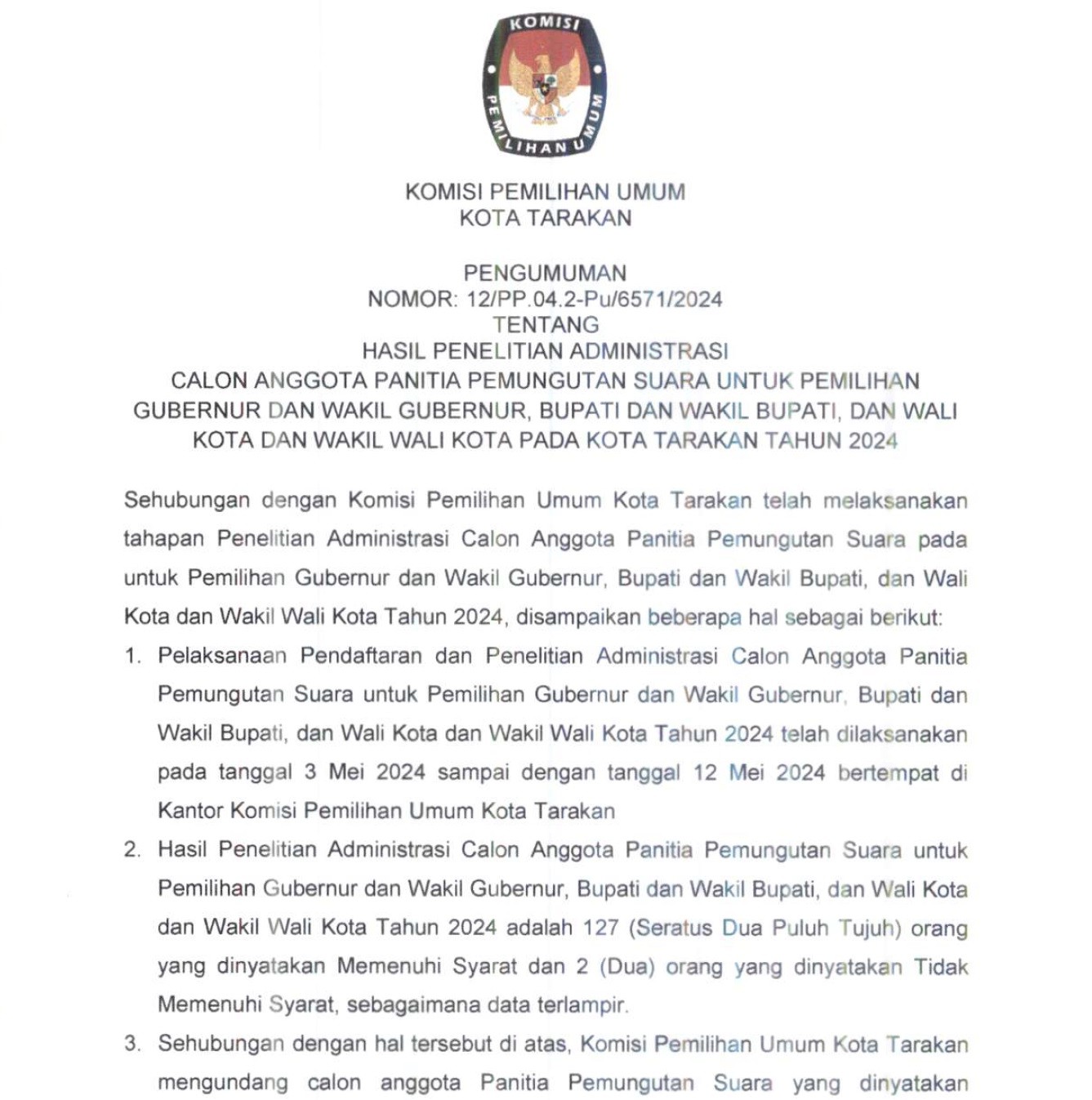 Berikut disampaikan Pengumuman Nomor 13/PP.04.2-Pu/6571/2024 tentang Hasil Penetapan Seleksi Calon Anggota Panitia Pemilihan Kecamatan (PPK) untuk Pemilihan Gubernur dan Wakil Gubernur, Bupati dan Wakil Bupati dan Wali Kota dan Wakil Wali Kota pada Kota Tarakan Tahun 2024. Sehubungan dengan hal tersebut di atas, Komisi Pemilihan Umum Kota Tarakan mengundang calon anggota Panitia Pemilihan Kecamatan Terpilih untuk hadir pada Pelantikan, pengambilan sumpah/janji, dan penandatanganan Pakta Integritas pada : Hari, Tanggal: Kamis, 16 Mei 2024 Pukul: 08.00 Wita s.d. selesai Tempat: Gedung Serba Guna Pemerintah Kota Tarakan Pakaian: Kemeja putih, celana/rok hitam, jilbab hitam (wanita), sepatu (wajib) Informasi lebih lanjut perihal pelaksanaan Pelantikan, pengambilan sumpah/janji, dan penandatanganan Pakta Integritas dapat disampaikan melalui Sekretariat KPU Kota Tarakan Alamat: Jl. Sei Sesayap RT. 1, Kel. Kampung Enam, Kec. Tarakan Timur, Kota Tarakan – Kalimantan Utara. Kontak: Julia Paulus (0853 5028 5565) Pengumuman klik > DI SINI