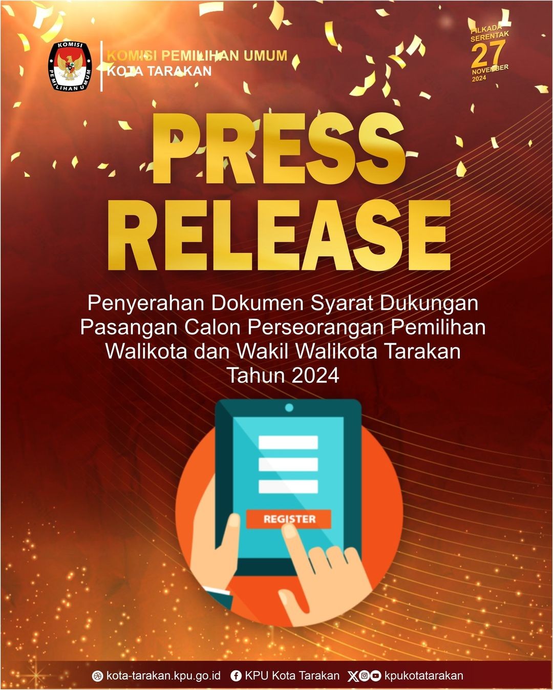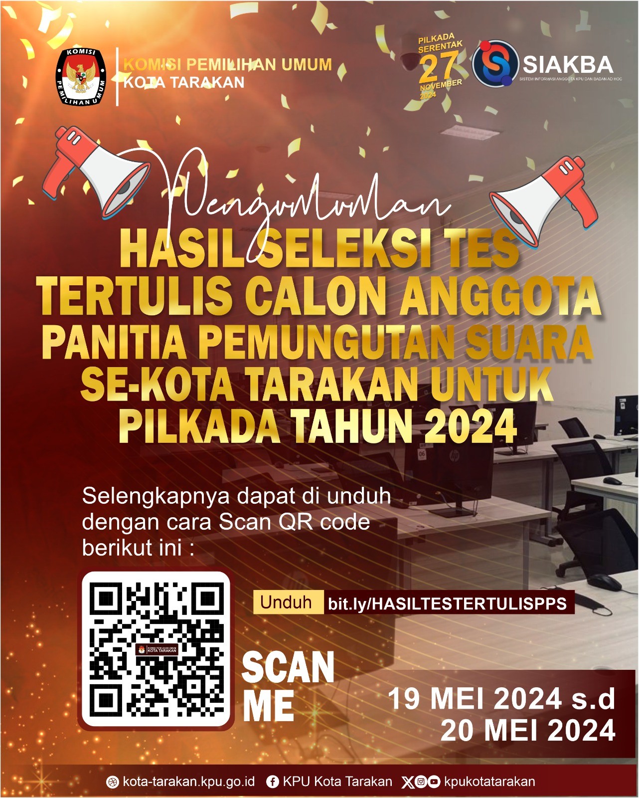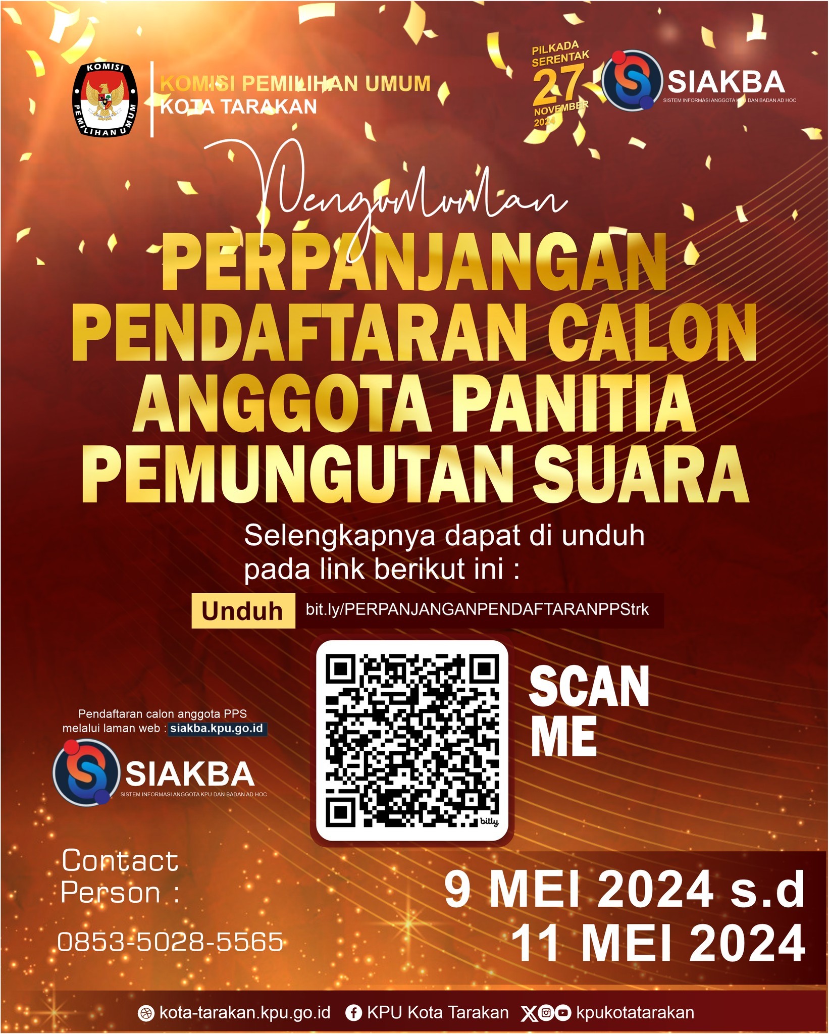 Berikut disampaikan Pengumuman Nomor 13/PP.04.2-Pu/6571/2024 tentang Hasil Penetapan Seleksi Calon Anggota Panitia Pemilihan Kecamatan (PPK) untuk Pemilihan Gubernur dan Wakil Gubernur, Bupati dan Wakil Bupati dan Wali Kota dan Wakil Wali Kota pada Kota Tarakan Tahun 2024. Sehubungan dengan hal tersebut di atas, Komisi Pemilihan Umum Kota Tarakan mengundang calon anggota Panitia Pemilihan Kecamatan Terpilih untuk hadir pada Pelantikan, pengambilan sumpah/janji, dan penandatanganan Pakta Integritas pada : Hari, Tanggal: Kamis, 16 Mei 2024 Pukul: 08.00 Wita s.d. selesai Tempat: Gedung Serba Guna Pemerintah Kota Tarakan Pakaian: Kemeja putih, celana/rok hitam, jilbab hitam (wanita), sepatu (wajib) Informasi lebih lanjut perihal pelaksanaan Pelantikan, pengambilan sumpah/janji, dan penandatanganan Pakta Integritas dapat disampaikan melalui Sekretariat KPU Kota Tarakan Alamat: Jl. Sei Sesayap RT. 1, Kel. Kampung Enam, Kec. Tarakan Timur, Kota Tarakan – Kalimantan Utara. Kontak: Julia Paulus (0853 5028 5565) Pengumuman klik > DI SINI