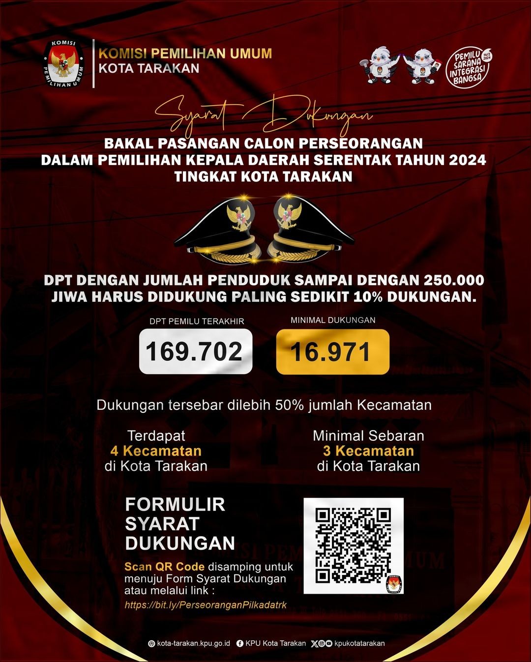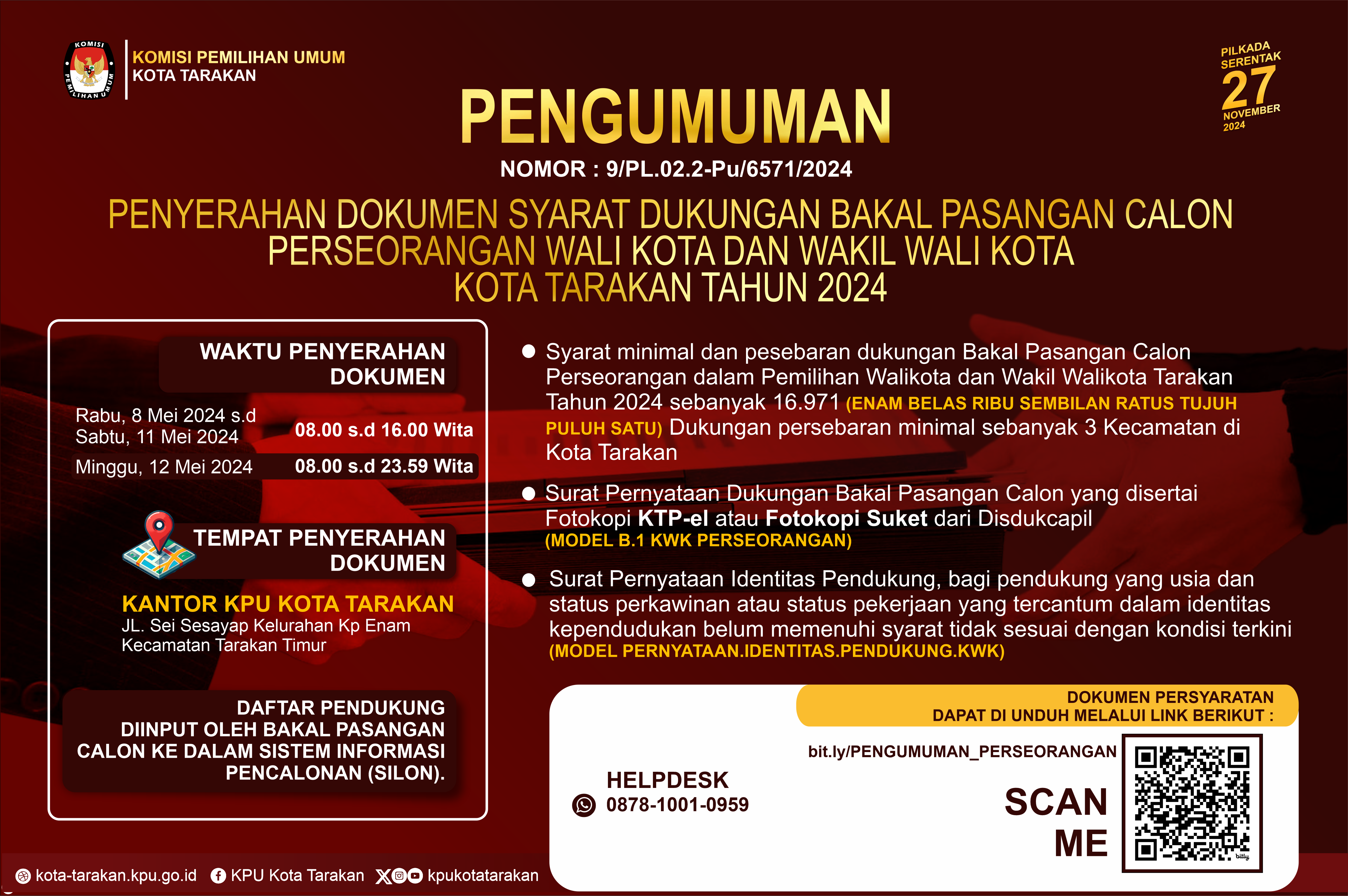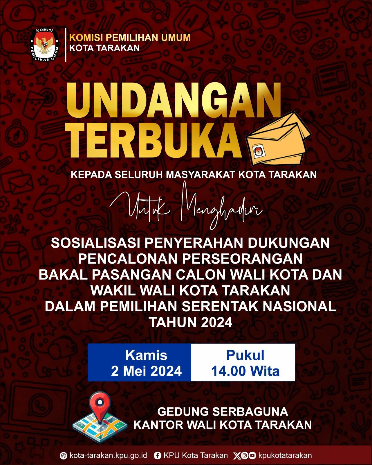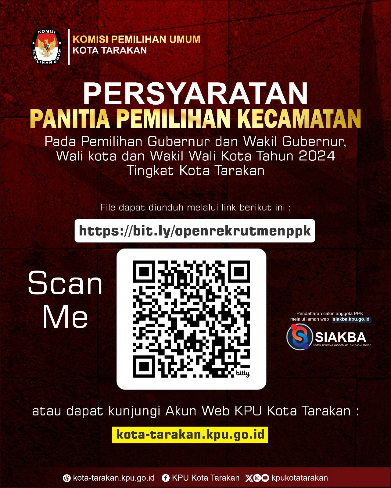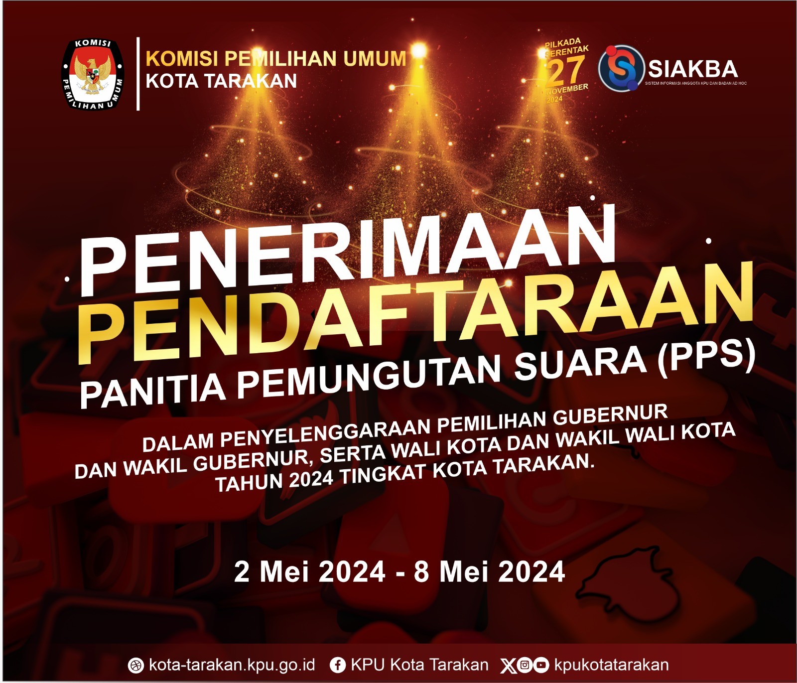 Komisi Pemilihan Umum Kota Tarakan membuka tanggapan dan masukan bagi masyarakat terhadap calon Calon Anggota PPK sejak tanggal 4 Mei 2024 sampai dengan 10 Mei 2024. Informasi lebih lanjut perihal pelaksanaan seleksi tertulis dan tanggapan dan masukan masyarakat dapat disampaikan melalui Sekretariat KPU Kota Tarakan.