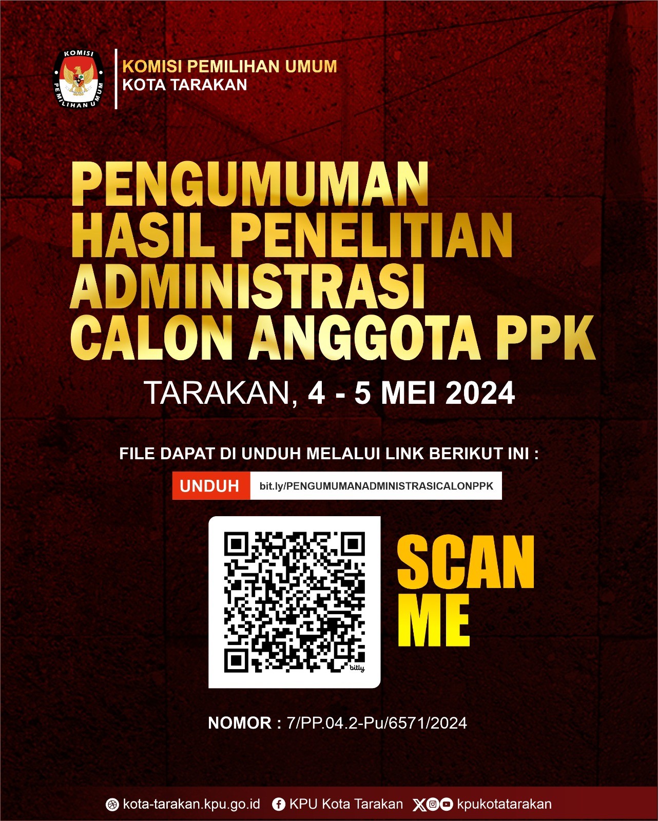 Berikut disampaikan Pengumuman Nomor 7/PP.04.2-Pu/6571/2024 tentang Hasil Penelitian Administrasi Calon Anggota Panitia Pemilihan Kecamatan (PPK) untuk Pemilihan Gubernur dan Wakil Gubernur, Bupati dan Wakil Bupati dan Wali Kota dan Wakil Wali Kota pada Kota Tarakan Tahun 2024.